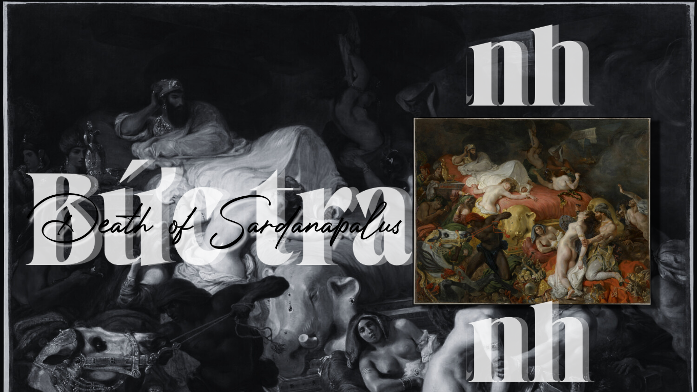 Cái chết của Sardanapalus, dựa trên câu chuyện về vị vua cuối cùng của Assyria từ thư viện lịch sử của Diodorus Siculus, là một tác phẩm thời đại chủ nghĩa lãng mạn. Bức tranh của Eugène Delacroix, vẽ năm 1827, sử dụng màu sắc phong phú, sống động và ấm áp. Trọng tâm chính là một chiếc giường lớn phủ vải đỏ phong phú, trên đó, một người đàn ông quan sát cảnh hỗn loạn với ánh mắt vô tư. Một người phụ nữ nằm chết dưới chân anh, cùng nhiều người khác trong cảnh chết chóc bởi bàn tay của nửa tá người đàn ông.