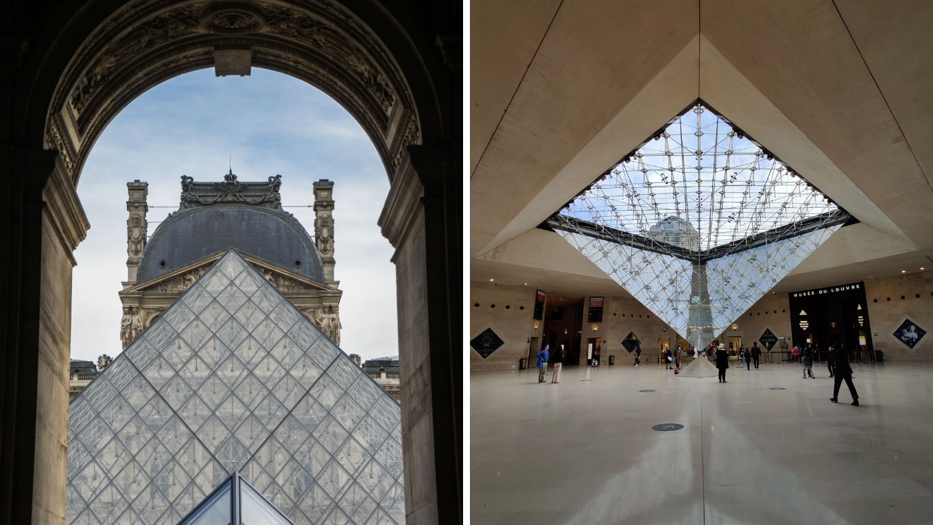 Louvre không chỉ độc đáo bởi các sưu tập hiện vật trưng bày mà còn độc đáo ở kiến trúc, điêu khắc, đặc biệt sự góp mặt của mô hình Kim Tự Tháp bằng kính (Pyramid) nằm ở chính giữa sân Napoléon của bảo tàng. Kim Tự Tháp bằng kính này do Kiến trúc sư nổi tiếng người Mỹ gốc Hoa Bối Duật Minh (Leoh Ming Pei) thiết kế, bắt đầu xây dựng năm 1983 và hoàn thành vào năm 1989 (dưới thời Tổng Thống Francois Mitterand). Bao bọc xung quanh Kim tự tháp chính là bảy đài phun nước hình tam giác hướng lối vào cho khách tham quan xuống tiền sảnh dưới tầng hầm.