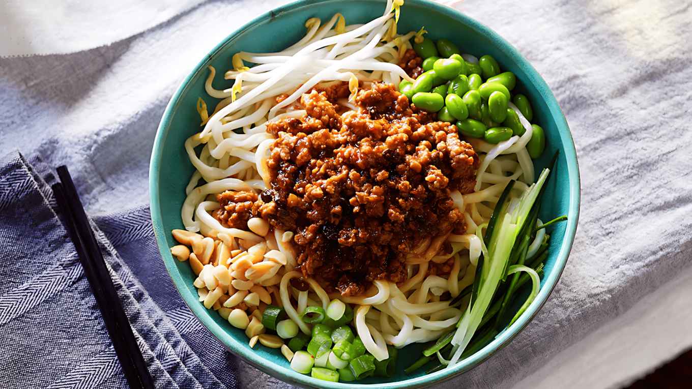 Một món ăn đặc trưng khác mà du khách không thể bỏ qua là món mì Zha Jiang Mian. Món ăn này được làm từ mì tươi luộc chín để ráo nước, trộn với nước sốt làm từ thịt lợn băm và ăn kèm rau thơm. Nếu như cái ngon của các món nước là ở nước dùng thì ở đây chính là loại xốt thơm ngon nóng hổi này. Nguyên liệu chính để làm nên món ăn là thịt băm nhỏ được phi thơm cùng hành và các loại xốt đậu, có thể dùng thêm ớt.