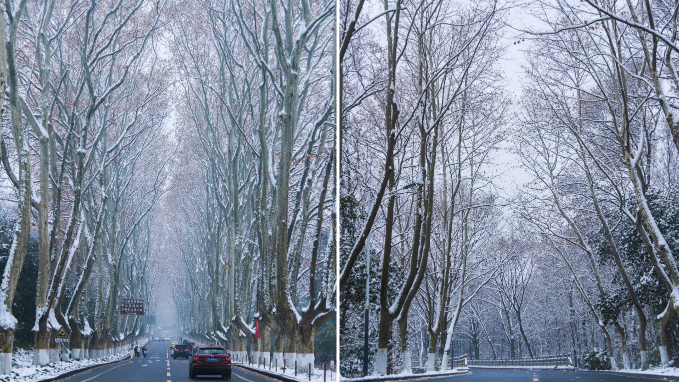Khi tiết trời chuyển lạnh, đại lộ Ngô Đồng khoác lên mình chiếc áo trắng xóa và tĩnh lặng. Những tán cây trút lá, chỉ còn lại những cành cây khẳng khiu đầy thi vị. Dù Nam Kinh hiếm khi tuyết rơi dày, nhưng chỉ một lớp tuyết mỏng cũng đủ để nơi đây biến thành bức tranh mùa đông tĩnh mịch và thanh tao. Đại lộ dường như chậm lại giữa guồng quay của cuộc sống – không dành cho sự vội vã, mà là dành cho những ai biết lắng nghe, chiêm nghiệm và tận hưởng vẻ đẹp trầm lắng của thời gian.