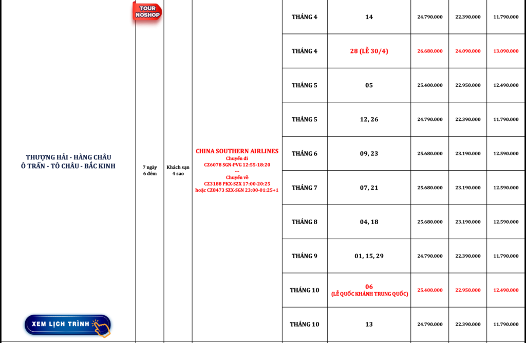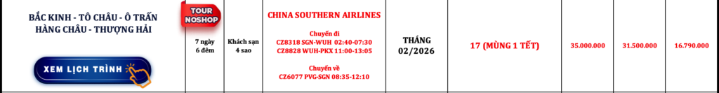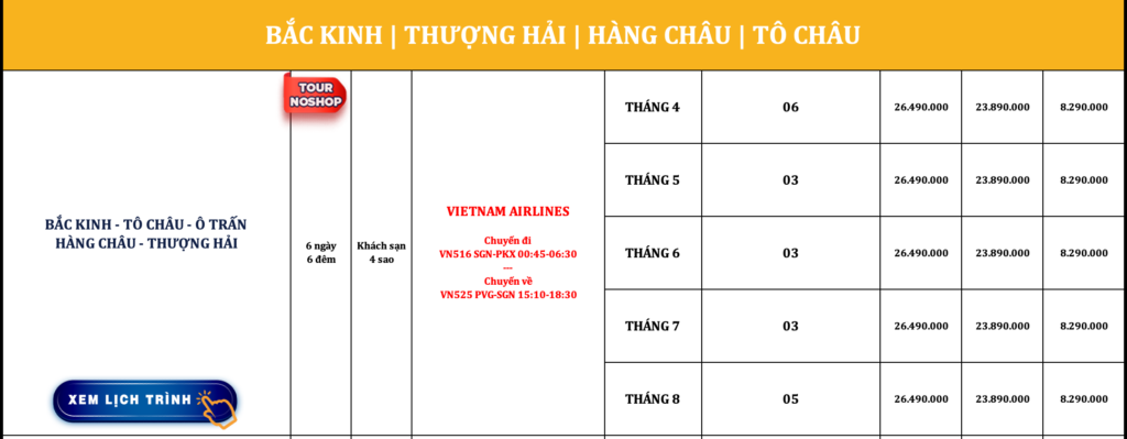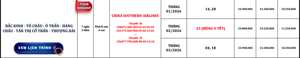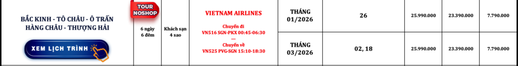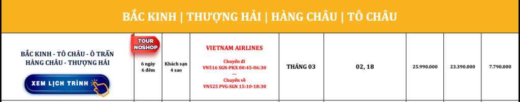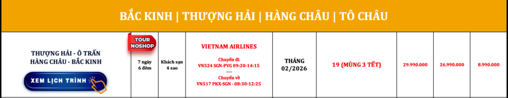 TRUNG QUỐC | BẮC KINH – TÔ CHÂU – Ô TRẤN – HÀNG CHÂU – THƯỢNG HẢI | 6N6Đ | NOSHOP