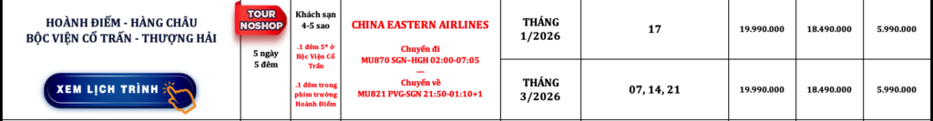 TRUNG QUỐC | HOÀNH ĐIẾM – HÀNG CHÂU – BỘC VIỆN CỔ TRẤN – THƯỢNG HẢI | 5N5Đ | NOSHOP