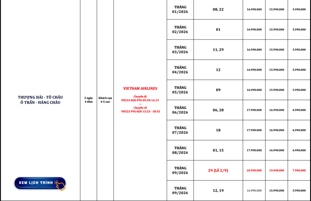 TRUNG QUỐC | THƯỢNG HẢI – TÔ CHÂU – Ô TRẤN – HÀNG CHÂU | 5N4Đ | VIETNAM AIRLINES