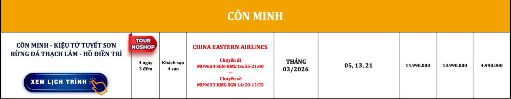 TRUNG QUỐC | CÔN MINH – KIỆU TỬ TUYẾT SƠN – RỪNG ĐÁ THẠCH LÂM – HỒ ĐIỀN TRÌ | 4N3Đ | NOSHOP