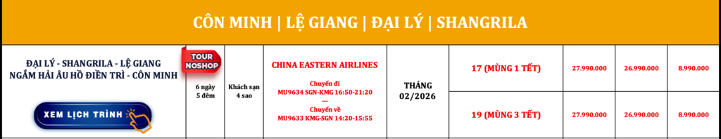 TRUNG QUỐC | ĐẠI LÝ – SHANGRILA – LỆ GIANG – NGẮM HẢI ÂU HỒ ĐIỀN TRÌ – CÔN MINH | 6N5Đ | NOSHOP
