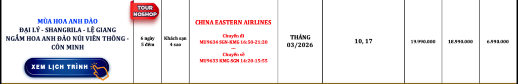 TRUNG QUỐC | ĐẠI LÝ – SHANGRILA – LỆ GIANG – NGẮM HOA ANH ĐÀO NÚI VIÊN THÔNG – CÔN MINH | 6N5Đ | NOSHOP