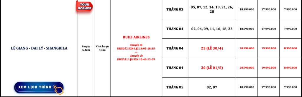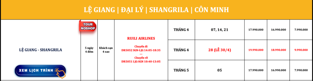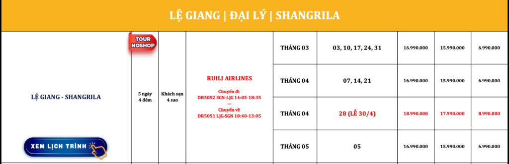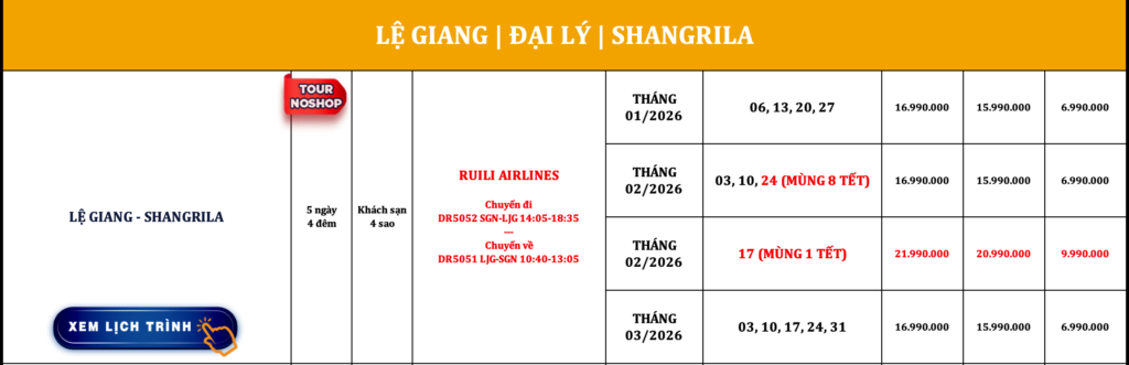 TRUNG QUỐC | LỆ GIANG – SHANGRILA | 5N4Đ | NOSHOP