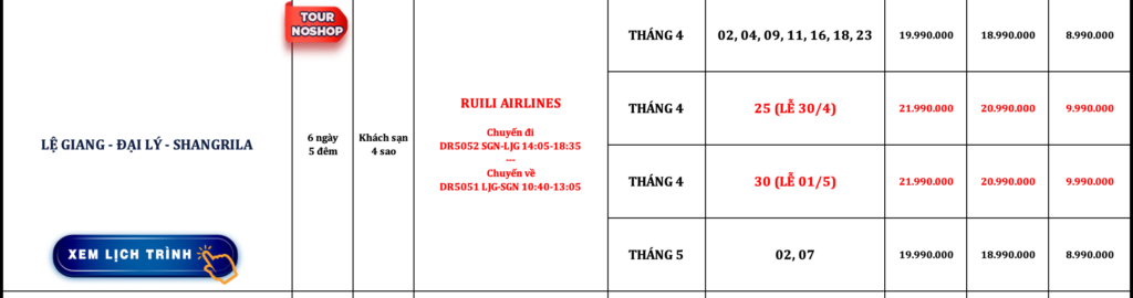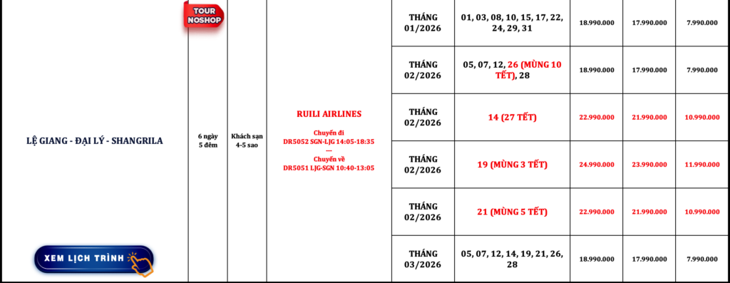 TRUNG QUỐC | LỆ GIANG – ĐẠI LÝ – SHANGRILA | 6N5Đ | NOSHOP