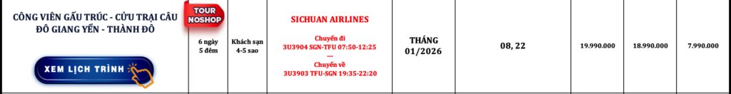 TRUNG QUỐC | CÔNG VIÊN GẤU TRÚC – CỬU TRẠI CÂU – ĐÔ GIANG YỂN – THÀNH ĐÔ | 6N5Đ | NOSHOP