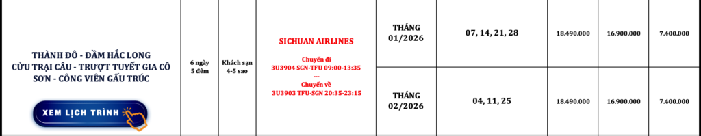 TRUNG QUỐC | THÀNH ĐÔ – ĐẦM HẮC LONG – CỬU TRẠI CÂU – TRƯỢT TUYẾT GIA CÔ SƠN – CÔNG VIÊN GẤU TRÚC | 6N5Đ
