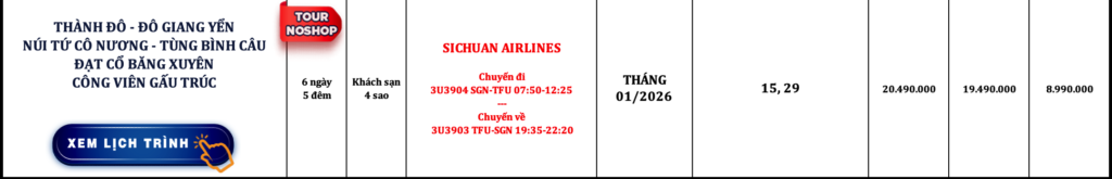 TRUNG QUỐC | THÀNH ĐÔ – ĐÔ GIANG YỂN – NÚI TỨ CÔ NƯƠNG – TÙNG BÌNH CÂU – ĐẠT CỔ BĂNG XUYÊN – CÔNG VIÊN GẤU TRÚC | 6N5Đ | NOSHOP