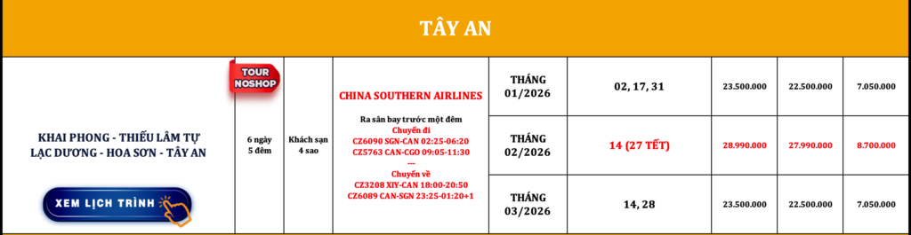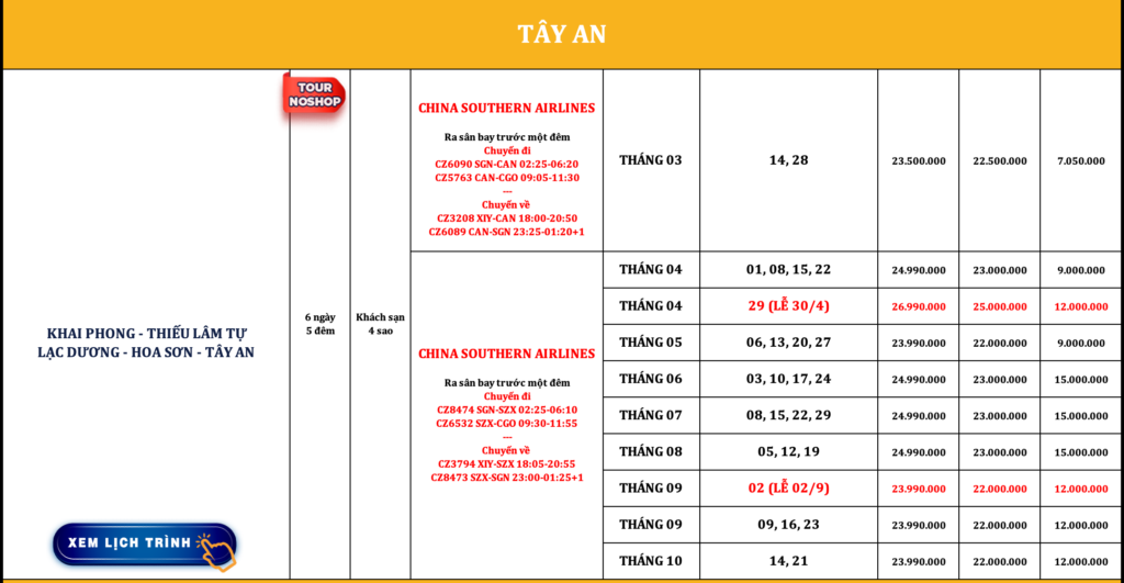 TRUNG QUỐC | KHAI PHONG – THIẾU LÂM TỰ – LẠC DƯƠNG – HOA SƠN – TÂY AN | 6N5Đ | NOSHOP