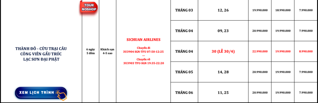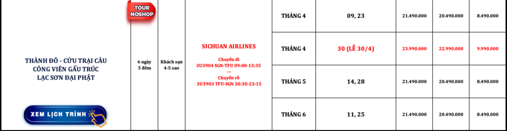 TRUNG QUỐC | THÀNH ĐÔ – CỬU TRẠI CÂU – CÔNG VIÊN GẤU TRÚC – LẠC SƠN ĐẠI PHẬT | 6N5Đ | NOSHOP