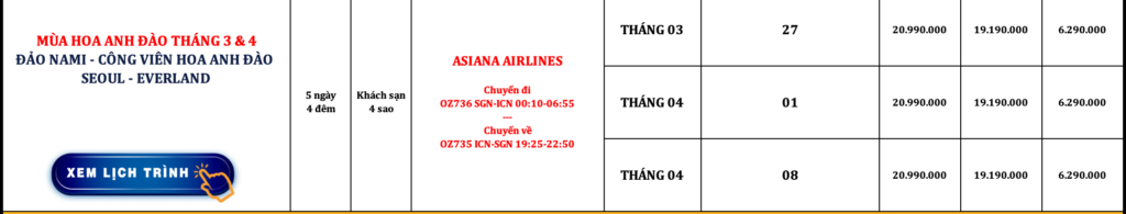 HÀN QUỐC | ĐẢO NAMI – SEOUL – CÔNG VIÊN HOA ANH ĐÀO – EVERLAND | 5N4Đ | ASIANA AIRLINES