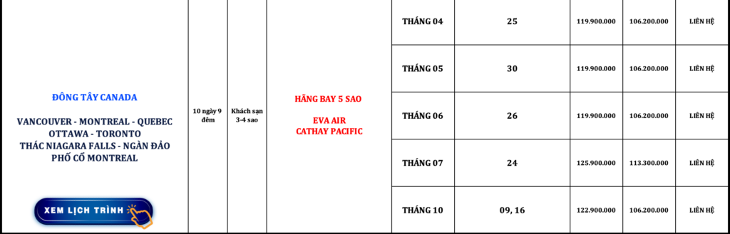 CANADA TÂY ĐÔNG | VANCOUVER – MONTREAL – QUEBEC – OTTAWA – TORONTO – THÁC NIAGARA FALLS – NGÀN ĐẢO – PHỐ CỔ MONTREAL | 10N9Đ
