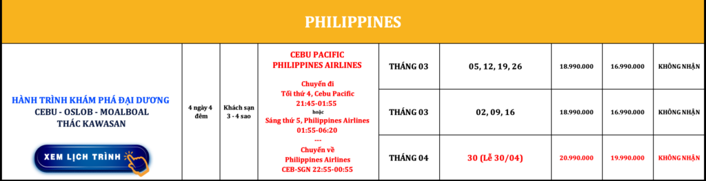 PHILIPPINES | CEBU – OSLOB – MOALBOAL – THÁC KAWASAN | 4N4Đ | PHILIPPINES AIRLINES