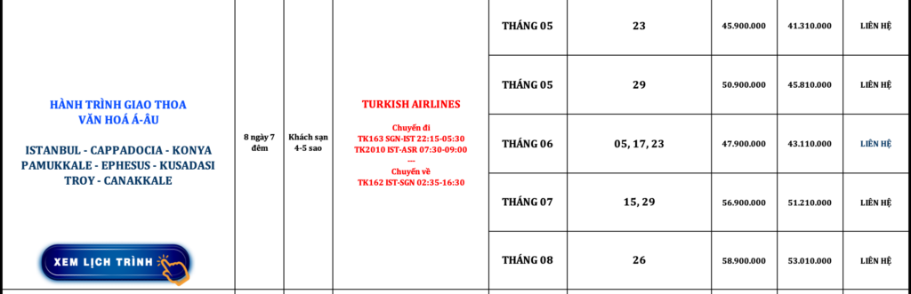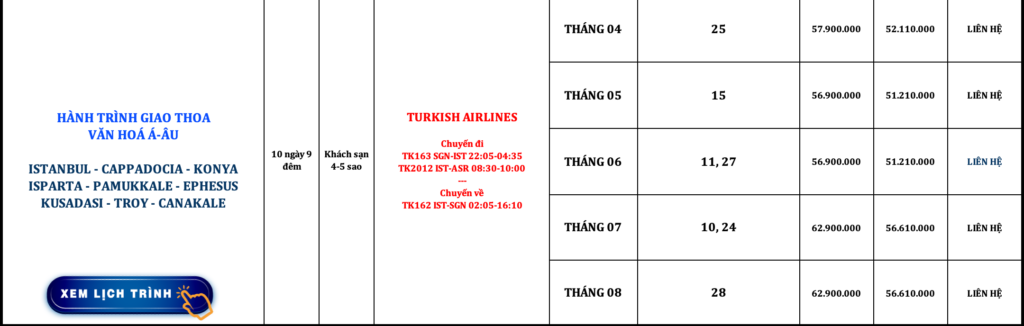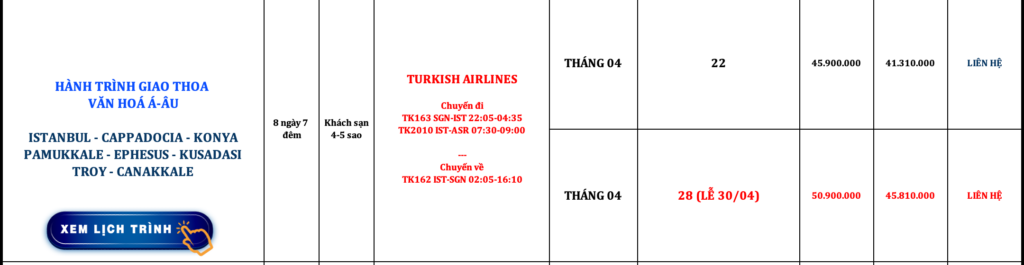 THỔ NHĨ KỲ | ISTANBUL – CAPPADOCIA – KONYA – ISPARTA – PAMUKKALE – EPHESUS – KUSADASI – TROY – CANAKALE | 10N9Đ