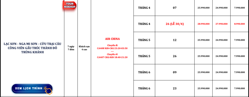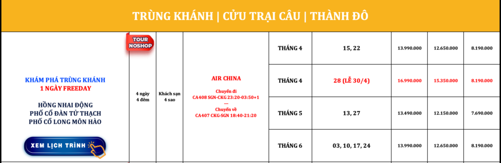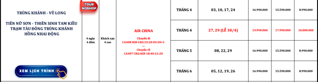 TRUNG QUỐC | TRÙNG KHÁNH – VŨ LONG | 4N4Đ | NOSHOP