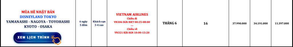 NHẬT BẢN | TOKYO DISNEYLAND – YAMANASHI – NAGOYA – TOYOHASHI – KYOTO – OSAKA | 6N5Đ | VIETNAM AIRLINES