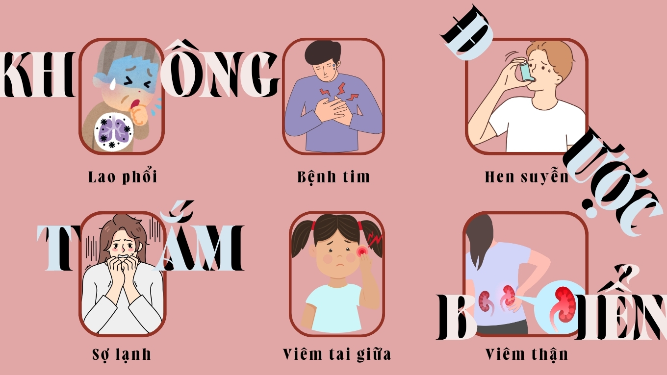 Một số bệnh lý và tình trạng sức khỏe không phù hợp để tắm biển vì có thể gây nguy hiểm. Những người bị viêm phế quản, hen suyễn, lao phổi, bệnh tim mạch, viêm thận, viêm tai giữa mạn tính có thủng màng nhĩ, người thần kinh dễ bị kích thích hoặc người thường xuyên sợ lạnh không nên tắm biển.
