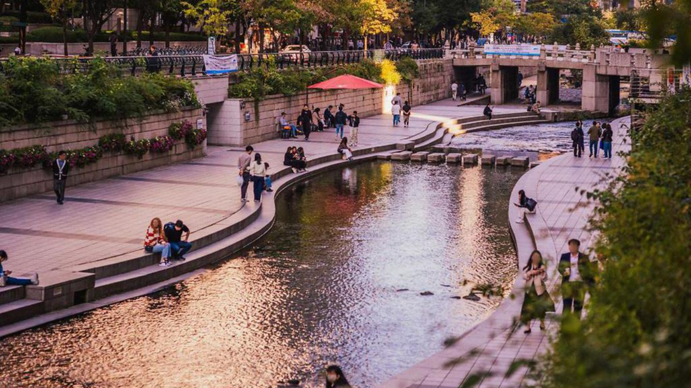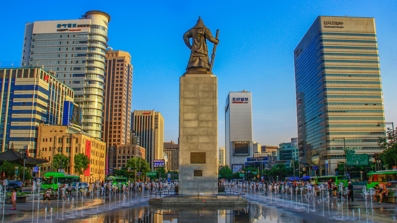 - Suối Cheonggyecheon, Quảng trường Gwanghwamun là quảng trường lớn nhất, đẹp nhất của thủ đô Seoul, Hàn Quốc. Một trong những điểm nhấn tạo ấn tượng và thu hút khách du lịch chính những dãy tòa cao ốc hiện đại ở hai bên, xen lẫn giữa bầu không khí nhuốm màu cổ kính của quảng trường. Mang đến cho bạn cảm giác dường như không gian và thời gian đang lắng đọng, tạm quên đi khoảng cách giữa quá khứ và hiện tại, giữa lối kiến trúc cổ xưa và hiện đại.