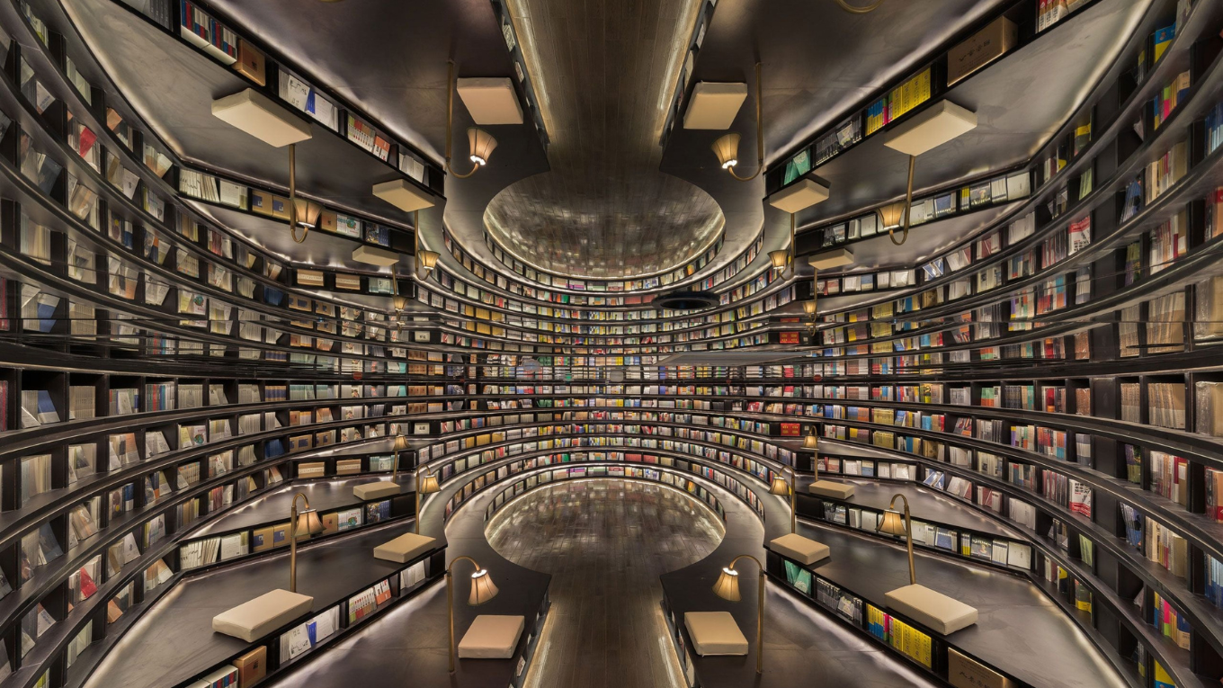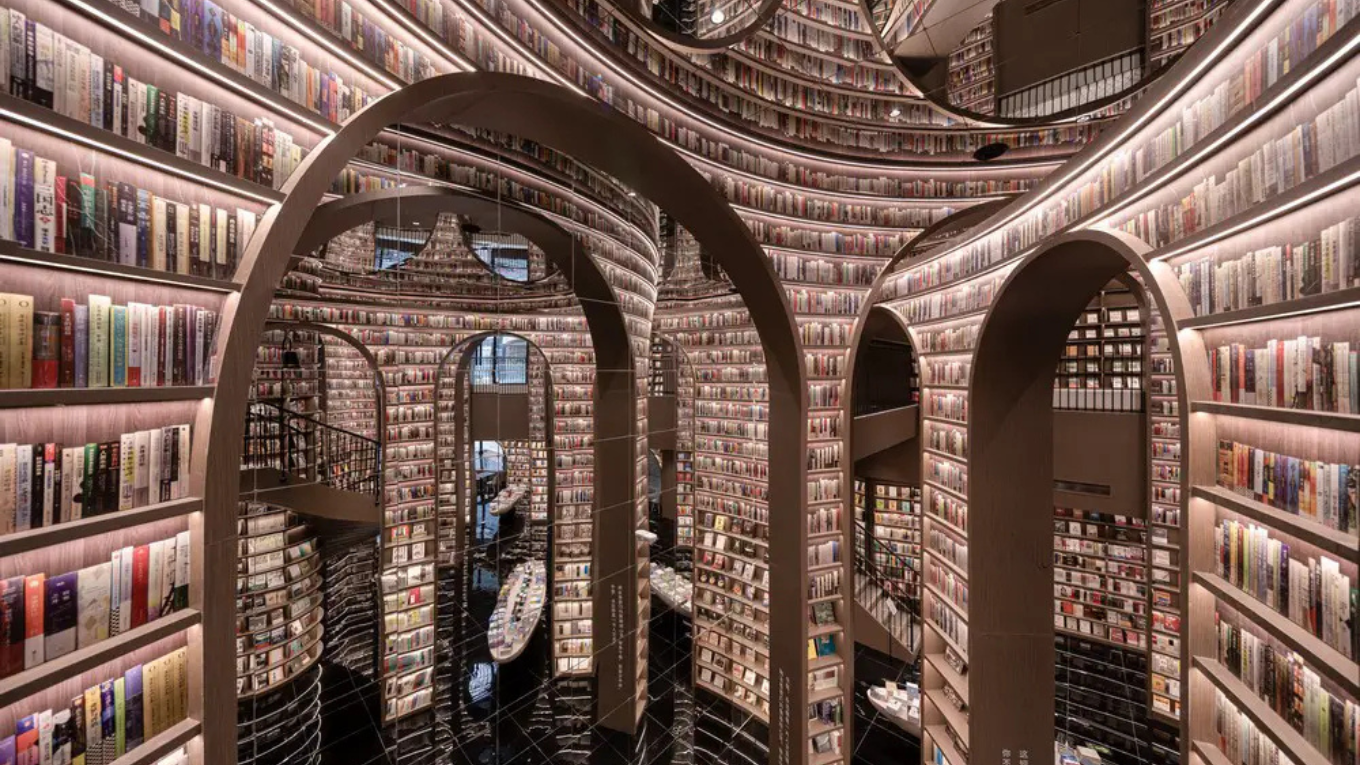 - Chuông Thư Các – Thư viện ở Hàng Châu nổi bật với trần nhà được tráng gương toàn bộ, sàn nhà đen bóng và hệ thống giá sách màu trắng, tạo ra hiệu ứng không gian “rừng cây” lấp lánh, trong đó các kệ sách là thân cây và đèn là đom đóm.